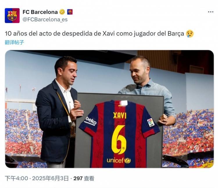 2015年6月3日,巴萨为哈维举办告别仪式,巴萨官方更新社媒动态,晒出哈维获赠纪念球衣的照片。