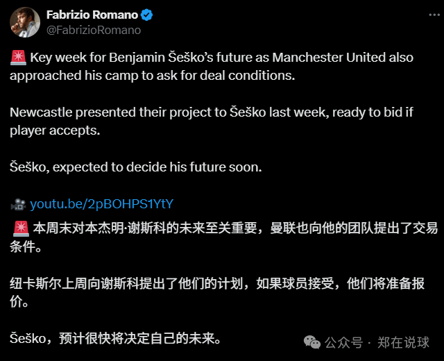 据罗马诺报道,在纽卡与莱比锡红牛前锋塞斯科进行谈判期间,曼联也加入了对这位中锋的争夺,并向塞斯科的团队提出了交易方案。曼联的介入,直接增加了纽卡签下塞斯科的难度。除了拥有欧冠资格外,纽卡在平台、影响力、甚至薪资空间等方面,很难与曼联抗衡。